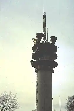 The Jakobsberg Telecommunication Tower (known locally as Langer Jakob or "Long James") was built on the site of the old Bismarck Tower from 1974 to 1978, also in concrete and steel. It is a 142 m high transmission tower (standard tower).