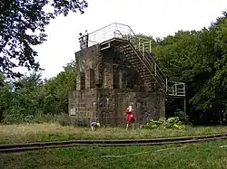 In the closing phase of the Second World War, most likely in March 1944, the manufacture of pipes by the firm of Philips was moved from the Netherlands to the Jakobsberg. Disused galleries of an old iron ore mine were developed. Such galleries run through many parts of the Wiehen Hills and Wesergebirge, their entrances are usually walled up nowadays and made unrecognisable. In Hausberge and Barkhausen there was a satellite of Neuengamme concentration camp with over a thousand prisoners,[1] of which a considerable number worked in the Jakobsberg. Women from the area also worked, under much better conditions, in the hill.[2] After the end of the war the local population used their surviving knowledge of the mine system running through the hills to collect material from the production facilities and sell it on the black market.[3] The British occupation forces brought this to an end with a demolition that caused pictures to fall from the walls up to a distance of 15 kilometres away and that created part of the present-day riverside front of the Jakobsberg.