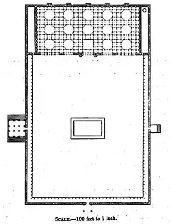 The Jama Masjid is one of many examples of the Gujarat style of architecture in Ahmedabad. The monuments in and around the old city fall roughly into two categories. The first category is associated with Ahmad Shah I during the first half of the 15th century and the second being associated with Mahmud Begada for the second half of the 15th century and beyond.[2] Built with yellow sandstone, the mosque complex is centred on a large rectangular courtyard 75 metres (246 ft) long and 66 metres (217 ft) wide. One enters the court by three entrances: south, east, and north.[1][2] One at the centre of each side. The primary entrance is the south facing entrance; the eastern porched entrance leads out to another enclosure, the tomb of Sultan Ahmad Shah I.[1] The courtyard is lined with a colonnade on three sides, the prayer hall occupies the western side.[5] In the centre of the courtyard is a rectangular basin for ablutions.[2]