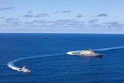 The USS Milwaukee (LCS-5) (right) with Jamaican Coast Guard ship HMJS Alexander Bustamante (left) conduct joint exercises supporting counter-illicit drug trafficking operations in 2022