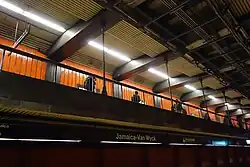 This underground station has two tracks and a 600-foot-long (180 m) island platform.[14][22] As planned, the island platform was to be 25 feet (7.6 m) wide.[23] The E stops here at all times.[24] The next stop to the west is Kew Gardens–Union Turnpike on weekdays during the day and Briarwood at other times. The next stop to the east is Sutphin Boulevard–Archer Avenue–JFK Airport.[25] As with other stations constructed as part of the Program for Action, the Jamaica–Van Wyck station contained technologically advanced features such as air-cooling, noise insulation, CCTV monitors, public announcement systems, electronic platform signage, and escalator and elevator entrances.[23] This station has five escalators and two elevators.[13]: 15