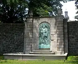 There are three primary entrances to the building: the main entrance hall, with three doors below the ionic columns, and doors to the east and west wings.[2][11] A 12-foot (3.7 m) wide pathway runs east-to-west connecting with the entrances, and leading to gates in the fence at 168th Street and Chapin Parkway.[12][25] The central pathway from the school to Gothic Drive splits in two separate stairways before intersecting with the street, forming a crescent shape.[12][26][27] The pathways were installed shortly after the school opened.[12][27] In front of the school where the stairway splits is a memorial to the Jamaica High School alumni who fought in World War II. It was designed by sculptor Paul Fjelde, and installed in 1948. The memorial is bronze, but has been oxidized green.[2][28] Prior to the war, a different sculpture and/or fountain had been in its place, installed along with the pathways.[5][12][27] The school building was designated as a New York City landmark in 2009.[2]