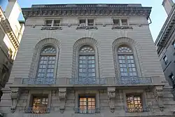 On the third story were spaces such as Burdens' ballroom, dining room, and reception hall,[17][26] which were used for hosting large events.[22] The ballroom was ornately decorated with tapestries.[17][26] It is designed in the Louis XIV style,[17][33] with paneled violet-gray marble walls[17] and a decorative plaster ceiling.[26] The ballroom still exists and is connected via a foyer to the reception hall, which can collectively seat 210 persons.[34] Behind it was the reception hall, which had gilded decorations.[22] The dining room had Campan vert marble walls with gilded trim,[17][26] as well as a marble fireplace mantel with various carved motifs such as grapes and goats' heads.[17] Adjacent to the dining room was the kitchen, which still exists. On the same story is the music room, which had gold-colored columns and a plaster coved ceiling.[26][35] The music room, which one newspaper described as costing $60,000, had other decorative features such as tapestries, crystal chandeliers, paneled walls, and wooden floors in a herringbone pattern.[35] The third floor also contained a salon and a tray hall, accessed by a niche.[17][36] The third floor retains most of its original functions and decorations,[26] and the spaces can be rented for events and film shoots.[37]