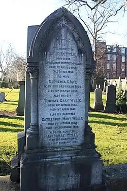 He died at 12 Archibald Place[2] (next to the old Edinburgh Royal Infirmary on 1 May 1890. He is buried with his wife, Euphemia Gray (1808–1845) and their children, in East Preston Street Burial Ground. The grave lies in the eastern part of the south-east section.