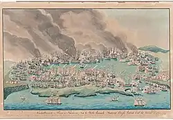 On 15 February 1812, Captain Maude was appointed to the Nemesis, 28 guns, armed en flûte.[5] In this ship, after escorting troops to Lisbon and Catalonia, he convoyed a fleet of transports to North America, where he was very actively employed, under the immediate orders of Rear-Admiral (afterwards Sir George) Cockburn; particularly at the capture of Portsmouth and Ocracoke Island, in North Carolina, on 12 July 1813.[5] In the rear-admiral's official letter, on this occasion, it is stated, that Captain Maude, "with much laudable zeal", attended to render him his personal assistance wherever circumstances might require it.[6]