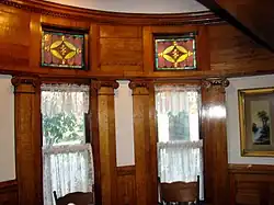 Lumberman Simmons' utilized oak extensively throughout the house. Features include a built-in oak china cabinet, carved oak newel posts, dentil molding, extensive oak panels, oak pocket doors, and oak flooring.