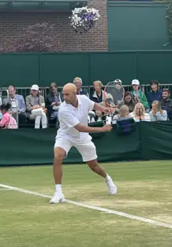 Blake playing in Wimbledon's Invitational Doubles tournament in 2023.