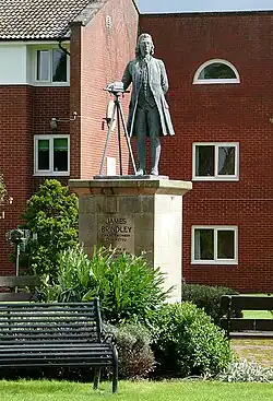 James Brindley died at Turnhurst on 27 September 1772.[4][5] He was buried on 30 September, just nine days after the completion of his Birmingham Canal, at St. James in Newchapel in Staffordshire, England. The commemorative plaque (1956) at the church shows his date of death as 25 September. The inscription on his grave reads "James Brindley, of Turnhurst, engineer, was interred 30 September 1772, aged 56."[6]