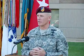 ![]() Yarbrough, as commander JRTC, holding a press conference at Fort Polk in 2008 | |