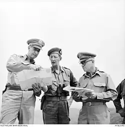 He relinquished command of the division to Major General Eric Bols in early 1947 to return to England, where he attended the prestigious Imperial Defence College. For his services in Palestine he was mentioned in despatches.[23] Promoted to the substantive rank of colonel on 19 August 1947,[24] he became Director of Land / Air Warfare at the War Office in January 1948.[20] Having been promoted to brigadier on 4 March 1948[25] and to major general on 20 December 1948,[26] he became Chief Liaison Officer with the United Kingdom Services Liaison Staff at Melbourne in Australia on 16 December 1949[27] and was appointed a Companion of the Order of the Bath in the New Year Honours 1950.[28] He became the first GOC of the 1st Commonwealth Division in July 1951 during the Korean War[20] for which he was awarded the Legion of Merit in the Degree of Commander by the U.S. President, Harry S. Truman on 16 September 1952[29] and appointed a Knight Commander of the Order of the British Empire on 10 October 1952.[30]