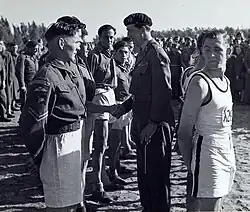 Major General James Cassels, GOC 6th Airborne Division, congratulates men of the cross country running team of the 8th Parachute Battalion on the occasion of the division's cross country run in which they ran second. Picture taken in Palestine, March 1946.
