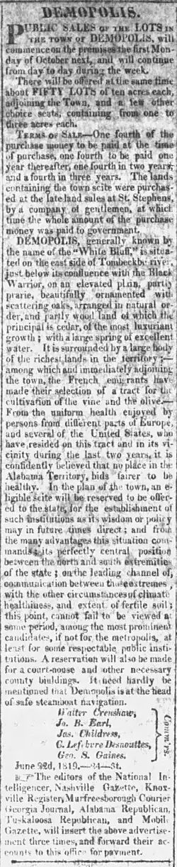- ^ "Tuscaloosa, Alabama". Daily National Intelligencer and Washington Express. December 9, 1819. p. 2. Retrieved 2025-06-01.