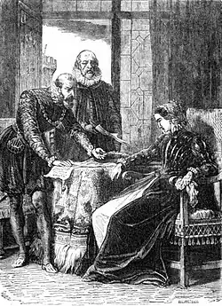 In September 1568, James Cockburn attended the conference at York as one of Mary's commissioners,[38] where Regent Moray produced the Casket letters.[39][40][41] He signed a statement made by his brother-in-law Lord Herries, a narrative of recent events, known as the "Book of Complaints".[42] On 16 October he signed as "Scarling, knycht" a reply made by Mary's commissioners which stated that she had resigned the crown of Scotland after taking the advice of the Earl of Atholl, William Murray of Tullibardine, and William Maitland of Lethington, who had sent Robert Melville to her at Lochleven with a ring and tokens to persuade her to sign to avoid her "present death" and without prejudice "in na sort" to her future rights. Lord Lindsay, according to the commissioners, brought the papers to Mary which she signed "with many tears, never looking what was in the writings". Skirling returned to Bolton from York.[43]