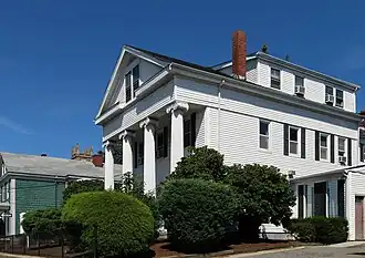 It is a 2+12-story, wood-framed structure, three bays wide, with a front-gable roof and a flush-boarded facade sheltered by a monumental two-story, Greek Revival style portico with fluted Ionic columns. It was built in 1843 by James D. Hathaway, a carpenter, and was perhaps designed by Russell Warren or copied by Hathaway from his designs.[2] It is one of seven extant monumental temple-fronted Greek Revival houses in Fall River. It is also located within the Lower Highlands Historic District.