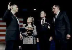 Watkins is sworn in as Energy Secretary. From left to right: James D. Watkins, Sheila Watkins, Chief Justice William H. Rehnquist, President George H. W. Bush.