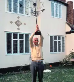 ![]() Dungey outside his home in Walberswick, holding aloft a weather vane given to him by colleagues at Imperial College London on his retirement in 1985. The vane is in the form of the schematic in his 1961 paper which introduced the concepts of magnetic reconnection and the open magnetosphere | |