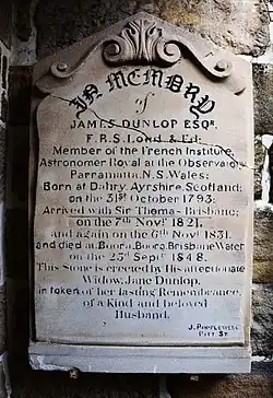 He arrived at Sydney on 6 November 1831 and found the observatory in a deplorable condition; rain had entered the building, roofing plaster had fallen down, and many important records were destroyed. Dunlop succeeded in getting the building repaired and started on his work with energy, but around 1835 his health began to fail; he had no assistant, and the building, having been attacked by white ants, fell gradually into decay. In August 1847, he resigned his position, and went to live on his farm on Brisbane Waters, an arm of Broken Bay. He died on 22 September 1848. In 1816 Dunlop married his cousin Jean Service, who survived him. Dunlop was awarded medals for his work by the King of Denmark in 1833, and the Institut Royal de France in 1835. He was elected a fellow of the Royal Society of Edinburgh in 1832, his proposer being Sir Thomas Makdougall Brisbane.[2]