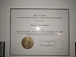 State of Iowa - Iowa State Historical Department - Office of Historical Preservation - This certifies that James E. Lindsay House has been entered in THE NATIONAL REGISTER OF HISTORIC PLACES - This action taken under provisions of the National Historic Preservation Act of October 15, 1966 and Chapter 303, the Code of Iowa. Signed by Governor of Iowa and State Historic Preservation Officer.