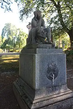 He is buried in Woodside Cemetery, Paisley beneath his own sculpture which he was working on for the grave of his father, who lies with him, when he died.[2] The monument stands alone, to the north-west of the crematorium, on the path descending into the lower north section.