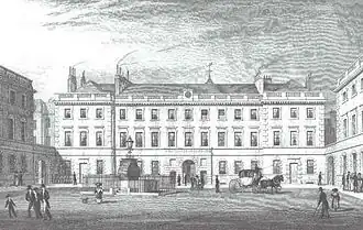 Mar attached Gibbs' name among the list of architects to be responsible for the new churches to be built under the Commission for Building Fifty New Churches, and in 1713 he was appointed one of the Commission's two surveyors, the contemporary term for an architect, alongside Nicholas Hawksmoor. He held this post for two years, until he was forced out by the Whigs, because of his Tory sympathies, and replaced by John James.[34] During his tenure he completed his first important commission, the church of St Mary le Strand (1714–17), in the City of Westminster. A previous design had been prepared by the English Baroque architect Thomas Archer, which Gibbs developed in an Italian Mannerist style, influenced by the Palazzo Branconio dell'Aquila in Rome, attributed to Raphael, as well as incorporating elements from Wren.[35] Such strong Italian influence was not popular with the Whigs, who were now taking political control following the accession of King George I in 1714, leading to Gibbs' dismissal, and causing him to modify the foreign influences in his work.[36] Colen Campbell's Vitruvius Britannicus (1715), which promoted the Palladian style, also contains unfavourable comments regarding Carlo Fontana and St Mary le Strand.[36] Campbell went on to replace Gibbs as the architect of Burlington House around 1717, where the latter had designed the offices and colonnades for the young Lord Burlington.