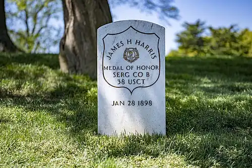 Over seven years later, on February 18, 1874, he was issued the Medal of Honor for "[g]allantry in the assault" at Chaffin's Farm.[3] Harris died at the approximate age of 69 and was buried at Arlington National Cemetery in Arlington County, Virginia.[1]
