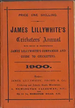 James Lillywhite's Cricketers' Annual was a cricket annual edited by Charles W. Alcock, the secretary of Surrey County Cricket Club, between 1872[1] and 1900.[1] It is generally referred to as "Red Lillywhite" because of the colour of the cover. It was published by James Lillywhite, Frowd & Co.,[2] and sold for 1s.