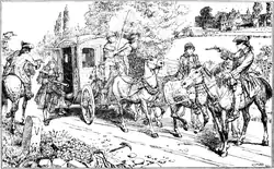 A well-known print (an "Exact Representation"), showing Maclaine and "his accomplice" holding up Lord Eglinton's carriage, was published on 13 August 1750, about a month before his trial.[25] The trial at the Old Bailey was held on 12 September, and related specifically to the robbery of Josiah Higden.[26][32] The indictment was that Maclean had made an assault on Higden on the King's Highway, putting him in corporal fear and danger of his life. (This was the capital offence.) It enumerated the goods taken, including a cloth coat, a pair of cloth breeches, a periwig, a pair of pumps, five holland shirts, three linen stocks, two pairs of stockings, one silk and one worsted, a pair of gloves, a pair of silver spurs and a pair of silver shoe-buckles, a pair of knee buckles, half a pound of tea and other necessaries, including two guineas which Mr Higden had about his person.[11][33]
