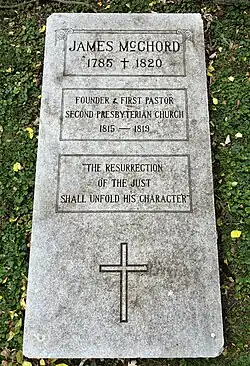 Before he was able to formally assume the presidency, McChord died suddenly on May 26, 1820.[1] He was buried in a vault in front of the pulpit of his church in Lexington.[2] In 1823, the church changed its name to McChord Presbyterian Church (also referred to as McChord's Presbyterian Church)[11] in his honor, but the name was changed again in 1828 to Second Presbyterian Church (a name it still retains), as some felt it was improper to name a church after an individual.[7] His grave remained at the church until 1924, when he was interred in Lexington Cemetery.[7]