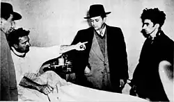 The day following Morelli's execution, the Chicago-based newspaper Herald-American (now known as the Chicago American) ran a story on Morelli's execution featuring a front-page photograph purported to display Morelli as he sat in the electric chair being executed.[26][27] Cook County Jail superintendent Chester L. Fordney declared the picture fake, disputing that any of the witnesses could have taken a picture because each witness was required to undergo inspection by the jail's "inspectoscope" to detect any contraband on them. Fordney insisted that any hidden cameras would have either been detected or fogged by the X-ray beam in the "inspectoscope." Instead, Fordney accused the Herald-American of painting a photorealistic body onto a picture of the Cook County electric chair and that the picture purported to be of Morelli contrasted press accounts of the execution. Fordney alleged that the picture of Morelli had no electrode on Morelli's right leg and disproportionately sized cables and chair fixtures. Fordney went as far as to place an aide in the clothes given to Cook County death row inmates before their executions, seat the aide in the electric chair, and photograph him to bolster his allegations.[3]