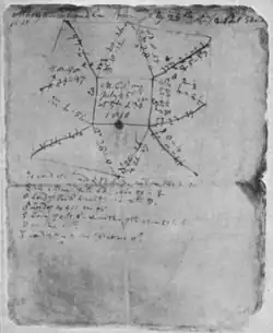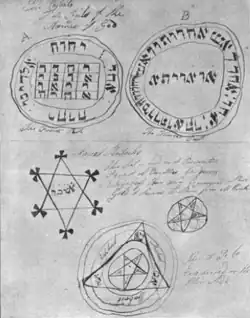 Murrell's correspondences and papers – then contained in the wooden chest owned by his son – were examined by Morrison during the course of his research.[54] Morrison discovered that Murrell was in possession of the manuscript of Key of Solomon grimoire on which he based his magical practise.[55] These texts survived until 1956, at which point they were burned by someone who did not believe them to be of any importance.[56] Many of Murrell's handwritten books were also lost, although his scrapbook of astrological data had survived until at least the late 1950s, when it was in the collection of a local man who also possessed Murrell's iron churchwarden pipe.[11]