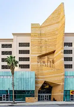 The building uses veined sandstone to mimic the look of American Southwestern canyons, with carvings reminiscent of Mese Verde cliff dwellings.[7] Weathered copper and turquoise panels evoke images of the Native American turquoise jewelry that is on display within the museum.