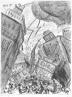 In 1911, he achieved a feat that was out of reach for most beginning artists when Louis Katz gave him a solo exhibition at his eponymous commercial art gallery on West 74th Street in Manhattan.[note 6] An equally unlikely outcome was a long and appreciative review of this exhibition in the Brooklyn Daily Eagle. Crediting Rosenberg with a "poetic sense," the paper's critic said the 40 pastels in the show were "sensitive and quietly impressive rather than bold and big in style, color," and added, "the subtle handling of themes are important points in the work." This critic went on to give favorable appraisals of many works by name, writing, for example, that "'Jamaica Bay, Emerald and Mauve,' shows a remarkable scenic effect, with its green-shot water and mauve areas. There are some evening effects with lights of big hotels along the shore, piercing the remembrance of sunset in the sky."[62] A critic for the New York Times was also impressed by the show, saying the pastels were "refined in color and show[ed] a vision sensitive to beauty." Of two of them, this critic wrote, "'Wet Street,' is a poetic transcription of a scene many times noted by the artists of the city, and 'Steam and Mist' is another successful version of the mysterious and exquisite effects with which New York clothes her medley of architecture."[66] In 1913, Rosenberg received a second solo exhibition of pastels, this time at the Arlington Art Galleries in Brooklyn, and, once again, the works displayed received favorable critical notice.[note 7] One critic praised a "refinement and practiced hand" and another said the pictures had "refined color and much feeling for nature."[68][69] A third critic was almost effusive, writing, "Many men aim at poetry through the medium of pictorial art, but it is not often they achieve the lyric bays so truly as this painter has done in this little group of pastels."[70][note 8] In 1916, he contributed a painting to the annual exhibition of the New York Water Color Club.[71] In 1917, he exhibited in the first group exhibition held by the Society of Independent Artists. The following year he showed pastels at the Anderson Galleries with all proceeds from sales to be donated to the Red Cross.[note 9] The show included landscapes and still lifes. A critic for the New York Tribune praised one of the former, "Scattering Clouds," as a "strong piece of work" revealing "deep blue mountains" against an "exquisite turquoise sky."[73] In 1921, he showed with Marsden Hartley at the Anderson Galleries.[63] The following year Rosenberg helped found a gallery called The New Gallery (and was called one of the gallery's "leading spirits and godfather").[8][74] The gallery was financed in part by an innovative scheme, the New Gallery Club, begun in February 1923. The club supported the gallery through its membership fees and it raised funds and publicized exhibitions by means of entertainments, teas, and receptions. Many club members were amateur artists whose work the gallery showed in special exhibitions.[75] In 1924, Rosenberg showed three paintings in a group exhibition at the gallery.[74] Four years later, he held a solo exhibition of Adirondack Mountain landscapes at the Erich Galleries.[64][note 10] At that time he told an interviewer that he painted simply for the joy of it. He said, "I have no suppressed longing to live in the South Seas and do nothing but paint. And I have no 'message' to give the world. I happen to be very fond of the Adirondacks, and my summer home is located among them."[64] His painting, "Adirondack Cloudburst," of 1946 (shown at right) is one of many mountain landscapes he made in the course of his career. In 1928, he contributed two paintings to a group exhibition of the Salons of America at the Anderson Galleries.[78][note 11] In 1929, Rosenberg departed from the style of painting and subject matter of his earlier work when he produced what turned out to be his best-known piece, a lithograph called "Dies Irae" (Day of Wrath), showing the October 29, 1929, Wall Street Crash as a horrific scene of destruction. On January 12, 1930, the New York Times put a reproduction of the lithograph on the front page of its Sunday magazine.[80] "Dies Irae" is shown at left.