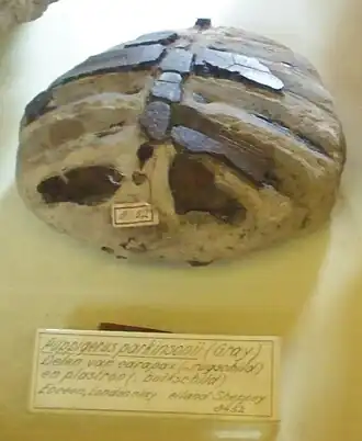 Fossilized turtle Puppigerus found in the London Clay on the Isle of Sheppey and named for Parkinson, collection Teylers Museum, Haarlem, Netherlands