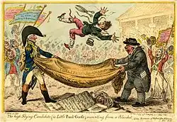 The poll lasted fifteen days, when Hood and Sheridan were elected. On one occasion, when the candidates were on the hustings, a stage was brought from Drury Lane, with four tailors seated at work, a live goose, and several cabbages. James Gillray brought out several caricatures, including (1) a view of the hustings in Covent Garden; (2) "the high-flying candidate, little Paull goose, mounting from a blanket" held by Hood and Sheridan; (3) "the triumphal procession of little Paull, the tailor, upon his new goose".[1]