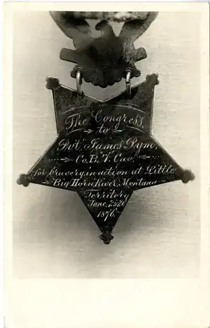 Private James Pym (1852 – November 29, 1893) was a British-born soldier in the U.S. Army who served with the 7th U.S. Cavalry during the Great Sioux War of 1876-77. He was one of twenty-four men who received the Medal of Honor for gallantry, Pym being among those who volunteered to carry water from the Little Bighorn River to wounded soldiers on Reno Hill, at the Battle of the Little Bighorn on June 25, 1876.