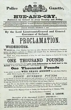 Following this event, Stephens, along with the others involved, was a wanted man. Reports of his death were published in the Kilkenny Moderator on 19 August with the intention of throwing the authorities off his trail.[31] He fled Ireland and escaped to France where he remained for the next seven years.[28]