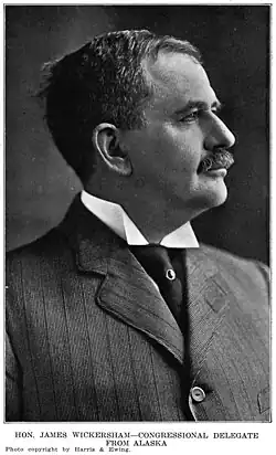 James Wickersham (August 24, 1857 – October 24, 1939) was a district judge for Alaska, appointed by U.S. President William McKinley to the Third Judicial District in 1900.[1] He resigned his post in 1908 and was subsequently elected as Alaska's delegate to Congress, serving until 1917 and then being re-elected in 1930. He was instrumental in the passage of the Organic Act of 1912, which granted Alaska territorial status. He also introduced the Alaska Railroad Bill, legislation to establish McKinley Park, and the first Alaska Statehood Bill in 1916. He was among those responsible for the creation of the Alaska Agricultural College and School of Mines, which later became the University of Alaska. A residence hall on the University of Alaska Fairbanks campus is named in his honor.