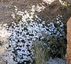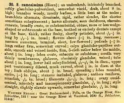 This extremely twiggy shrub ('ramosissima'), which grows to about 1m in height, bears a profusion of white or bluish-mauve flowers and is found growing under semi-desert conditions in cracks in sheetrock and on steep, bare, rocky slopes in very dry and hot locations bordering the Gariep River, from near the Augrabies Falls, through the Richtersveld to the vicinity of the river mouth. The branches of this shrub are woody and rigid, divaricate, and sometimes spinescent. The thick and rather fleshy leaves are alternate, shortly petiolate, obovate-cuneate to broadly ovate in shape, with a wedge-shaped base, margin toothed except at the base, about 2-6mm long by 2-6mm broad.[3]