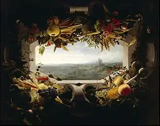 The 1659 inventory of Archduke Leopold Wilhelm's collection shows that it included 12 works by van der Baren.[3] The works of van der Baren in the collection comprised, besides still lifes, some architectural and park landscapes. To date no examples of works other than still lifes have been attributed to van der Baren. Some of his known still lifes include an architectural background (such as the Still Life with Pumpkins in the Kunsthistorisches Museum) or a landscape view (such as A Seascape within a Garland of Fruit in the Powis Castle and Garden, Powys, Wales, National Trust).[2]