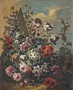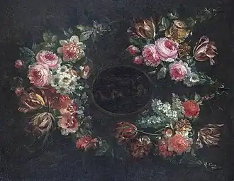 His 'garland paintings' go back on a genre of flower representation invented in early 17th century Antwerp by Jan Brueghel the Elder. The genre was subsequently practised by leading Flemish still life painters, such as Daniel Seghers. Paintings in this genre typically show a flower or, less frequently, fruit garland around a devotional image or portrait. In the later development of the genre, the devotional image was replaced by other subjects such as portraits, mythological subjects and allegorical scenes.[6][7]