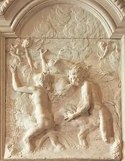 De Cock also made a set of four sculpture groups representing the four continents (Princeton University Art Museum). The set once were in the collection of the American statesman Elias Boudinot IV (1740–1821). The continents are personified by women shown with bear attributes characterizing each continent and its peoples. Europe features a domed temple, papal crown, books, arms and armor, grains, flowers and a horse. These symbolized Europe's religious, cultural and military achievements and its abundant resources, which in the European ideology of that time was deemed to reflect the Christian God's favor.[23] Another allegorical group is the Allegory of War and Peace (Stedelijk Museum Breda), a terracotta sculpture, which was possibly created at the time of the peace talks in the War of the Spanish Succession held in 1710 in Geertruidenberg.[24][25] An example of the work he did for the Princes of Orange in the Dutch Republic are the bas reliefs with the mythological scenes of Alpheius and Arethusa and Apollo en Daphne, both signed and dated 1707. They are located in the house at the Korte Vijverberg 3, The Hague, where the Dutch cabinet holds its meetings. These companion pieces depict scenes of mythological lovers taken from Ovid's Metamorphoses.[26][27]