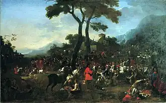 After moving to Turin in 1658, he decorated the royal hunting lodge at Venaria Reale with large-scale hunting scenes (portions of which are now lost). He painted more and more history paintings which demonstrate an intensification of the classical tendencies already present in the religious paintings of the 1650s. Miel also began to study and copy the works of Raphael and Annibale Carracci, just as he had copied the works of Pieter van Laer at the beginning of his career.[2]