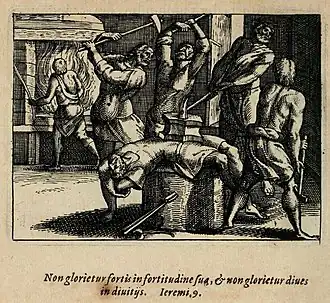 Snellinck's designs were used in various publications, some of which were published by his father-in-law Gerard de Jode, a prominent publisher of his time. One of these publications was the illustrated bible Thesaurus veteris et novi Testamenti published by Gerard de Jode in 1585. The prints were designed by at least 14 Flemish artists including Maerten de Vos, Crispijn van den Broeck, Pieter van der Borcht the Elder and Marten van Cleve. To Jan Snellinck have been attributed the design of about 50 prints in this illustrated bible. De Jode relied for the Thesaurus largely on existing prints and likely ordered missing designs from his son-in-law Snellinck. Snellinck also provided the designs for the emblem book Μικροκόσμος. Parvus Mundus (the Small World) by Laurentius Haechtanus. This book was published by Gerard de Jode in 1579. Seven design drawings of Snellinck for the publication are in the collection of the Rijksmuseum were they are attributed to Crispijn van den Broeck. Two further designs are in the British Museum were they are attributed to Karel van Mander.[19]