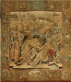 Snellinck is known to have painted the cartoons for a number of tapestry sets woven in Flanders. He worked on a set of seven tapestry works, which were commissioned by the city of Antwerp to be used as decorations during the celebrations during the joyful entry of the Archdukes Albert and Isabella Clara Eugenia in the city on 10 December 1599. The tapestries, together with the cartoons, were gifted to the Archdukes after the event.[11][15][16] While the tapestries later ended up in the Royal Collection in Spain, the cartoons remained in Brussels where they were later destroyed by fire or lost. The tapestry series is entitled the Battles of the Archduke Albert and depicts the military successes of Archduke Albert in Calais, Ardres and Hulst. The designs were made by Otto van Veen while Snellinck painted the full-size cartoons. The tapestries were woven in the workshop of Maarten Reymbouts the Younger in Brussels in the period from 1597 to 1599.[15][16] The central panel of each tapestry depicts a military action including portraits of some of the military leaders involved in the action including the Archduke. The borders of each tapestry are filled with war trophies, victory palms, maces and clubs while the corners are decorated with Medusa heads.[15] Sellinck also provided a series of cartoons for armorial tapestries, with the coat-of-arms of Ambrogio Spinola (c. 1605–1619). These tapestries were also woven in the workshop of Maarten Reymbouts the Younger in Brussels.[22]