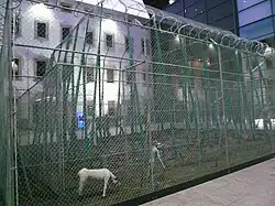 Inside the triple barrier fencing in Alexanders 2007 piece Security with traffic (influx control) there is dark earth spread on the ground which is partly covered by matches, sickles, gloves and inner tubes. There is also a diverse group of hybrid creates inside. Alexander created this piece in reference to a barrier financed by the European union and built by the Spanish government in Melilla, which blocks an entrance into EU territory.[7] This piece is also likely a commentary on migration, surveillance, land resources and ownership, and exploitation.[16]