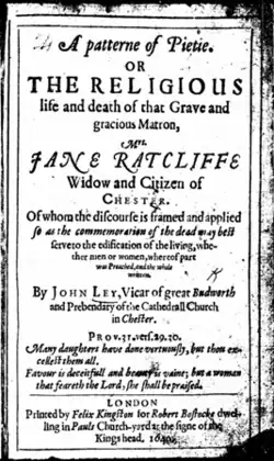 She died in London in 1638.[1] In 1640 John Ley who was a clergyman and member of the Westminster Assembly published A Patterne of Pietie, or the Religious life and death of that grave and gracious Matron, Mrs. Jane Ratcliffe, Widow, and Citizen of Chester, 1640. It was addressed by Ley to Brilliana, Lady Harley and Alice, Lady Lucy[3] and it has been noted that Ley's tribute was self-serving. He used his description of Ratcliffe's life to support his views on religion.[1]