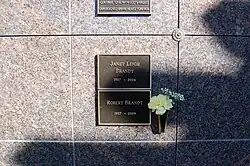 Leigh died at her home in Beverly Hills on October 3, 2004, at age 77 after a protracted battle with vasculitis.[95] Her death surprised many, as she had not disclosed her illness to the public. She was survived by her daughters Kelly and Jamie and her husband of 42 years, Robert Brandt.[11] Leigh was cremated and her ashes were entombed at Westwood Village Memorial Park Cemetery in the Westwood Village neighborhood of Los Angeles.[96][97]