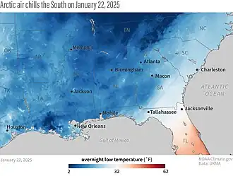 - ^ a b c Mascarenhas, Karina Tsui, Robert Shackelford, Mary Gilbert, Lauren (January 20, 2025). "Southern states declare emergencies ahead of potentially historic snow, as cold temps chill 220 million people". CNN.
