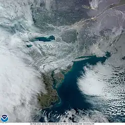 ![]() GOES-16 satellite image of the nor'easter impacting the Northeastern United States at 18:00 UTC (1:00 p.m. EST) on February 1 | |