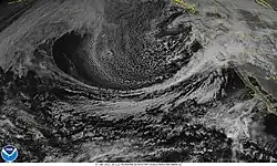 In late January 2021, an extratropical cyclone developed in the Northeastern Pacific Ocean, to the south of Alaska.[10][11] The system subsequently occluded and strengthened, reaching a peak intensity of 984 millibars (29.1 inHg) at 18:00 UTC on January 26, before gradually weakening, while slowly moving southeastward.[12][13] The system drew moisture northeastward from the North Central Pacific towards the West Coast of the United States in a phenomenon known as the Pineapple Express, an atmospheric river known to affect the West Coast of the United States for periods of time during the winter. The main focus of this plume of moisture was directed towards the state of California on January 26, bringing heavy amounts of rain and snow.[14][11] By 15:00 UTC, the Weather Prediction Center (WPC) began issuing storm summary bulletins for the storm, as it was impacting California.[15] On January 27, the storm began moving towards the West Coast, with the storm's trough and cold front reaching the coasts of Oregon and Northern California, channeling a large atmospheric river into California in the process,[16][11] triggering a Category 2 Atmospheric River event for California (based on a scaling system devised by the Scripps Institution of Oceanography that ranks atmospheric river events from 1 to 5).[11][17] The low-pressure system responsible slowly moved eastward near the coastline, prolonging impacts until it moved inland early on January 29, in a weakened state.[18] During this time, the storm's cold front and the atmospheric river gradually moved southward, reaching Southern California by 00:00 UTC on January 29, increasing the intensity of the precipitation in the southern part of the state.[11] The storm continued moving eastward towards the Rocky Mountains while weakening, and later on January 29, the WPC terminated storm summary bulletins for the storm over the West Coast, as impacts had generally diminished.[19]